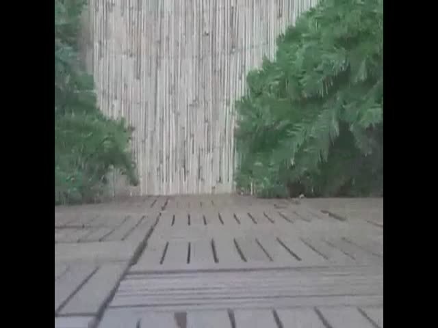 Chubby housewife that's wearing a black office outfit is pooping on the front porch.