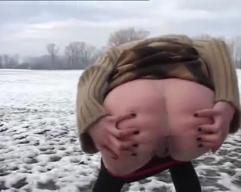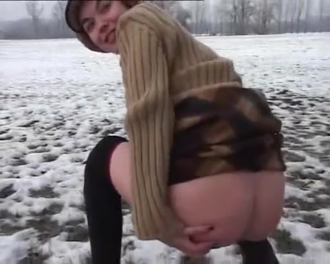 Pooping outside in the winter with finger in the butt