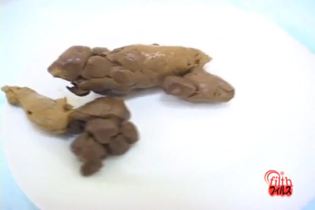 Brown haired Japanese teen dropped a long brown turd on a white plate. She cuts her long turd with a metallic knife.