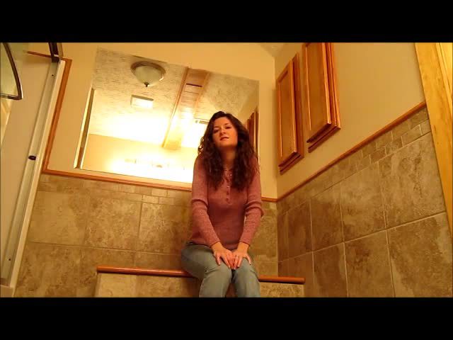 Amateur brunette with curly dark hair is shitting on the bathroom floor.