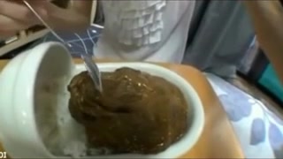 Beautiful Japanese teen eating liquid shit from a glass bowl with a metallic spoon.