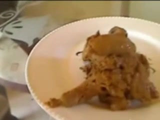 Hot brunette cam girl just finished pooping on a white plate. She's eating fresh shit for free.