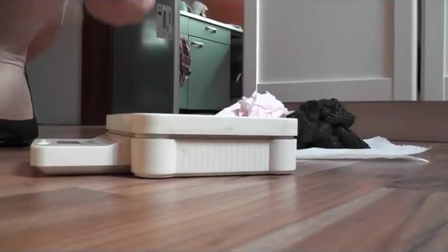 Beautiful brunette teen dropped a big pile of shit on the kitchen floor. She's wearing black high heels.