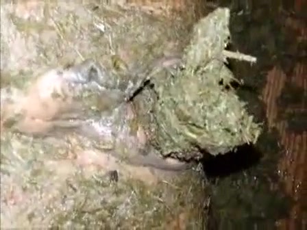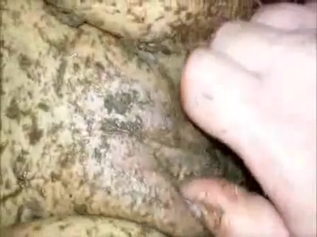 Drunk brunette wife sitting naked on the ground, outdoor. She lets her husband to smear poop on her entire naked body.