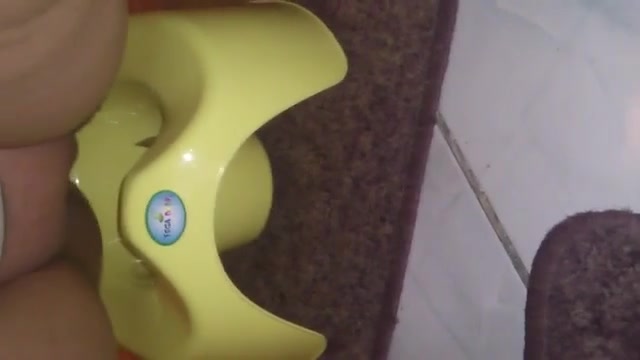 Shaved girl pooping in a yellow potty. She wiped her ass and left like nothing happened.