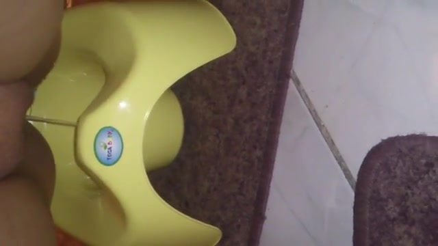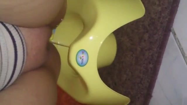 Shaved girl pooping in a yellow potty