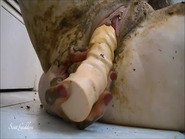 Sexy girl records herself while she's masturbating with a dirty dildo. She smears fresh poop on her pussy and legs.