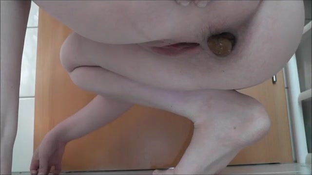 Beautiful naked girl dropped a huge turd on bathroom floor. Sexy girl sitting naked on her knees while pooping.