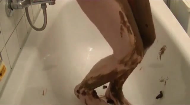 Smoking hot brunette rubbing shit on her entire body. She sits naked on her knees in bathtub while smearing shit. Sexy masked girl pooping and smearing crap.