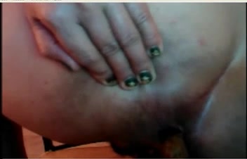 Amateur girl sitting naked on her knees while pooping a big one on a white plate.