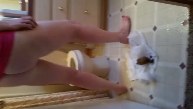 Sexy blonde wife spreading her big butt cheeks wide opened so she can easily poop on bedroom floor. She dropped a big chunk of shit on a white napkin.