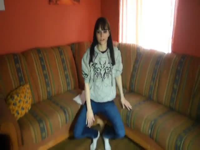 Brunette hottie pulled her tight blue jeans down so she can easily poop on her white sneakers.