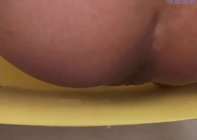 Asian teen sitting half naked on her knees on a plastic chair while pooping a big turd, on bedroom floor.