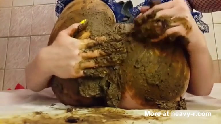 Amazing brunette babe smearing poop on her half naked body. She's fingering her tight pussy, masturbating with scat.