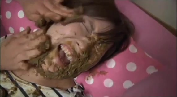 Japanese mother forced her step daughter to sit half naked on bed. She's smearing fresh shit on her entire face.