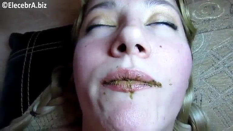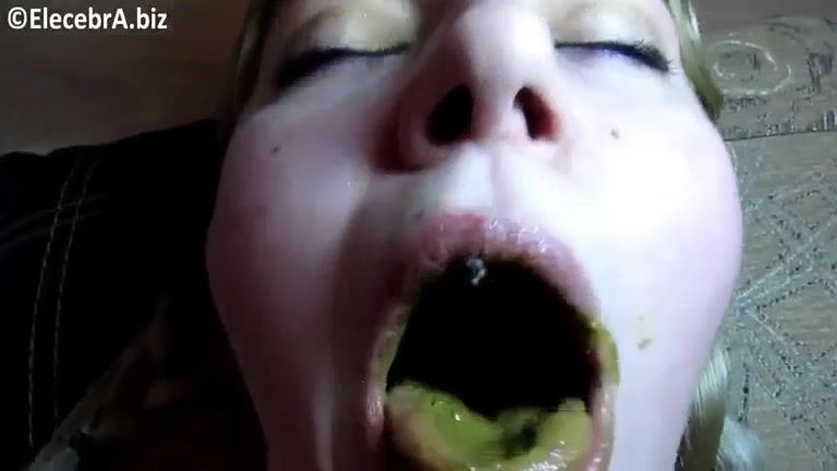 Blonde girlfriend sits naked on bedroom floor. She was forced to eat poop by her naughty boyfriend.