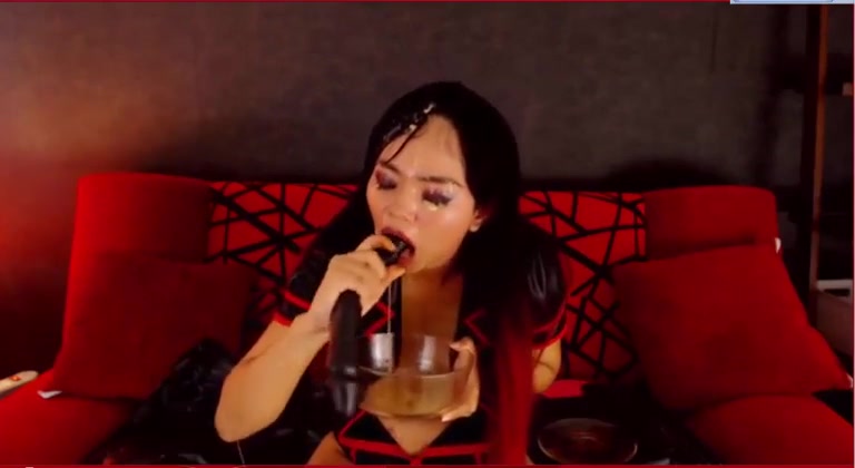 Asian babe sitting half naked on her knees while she's deepthroating a long black dildo. She starts puking in a glass bowl.