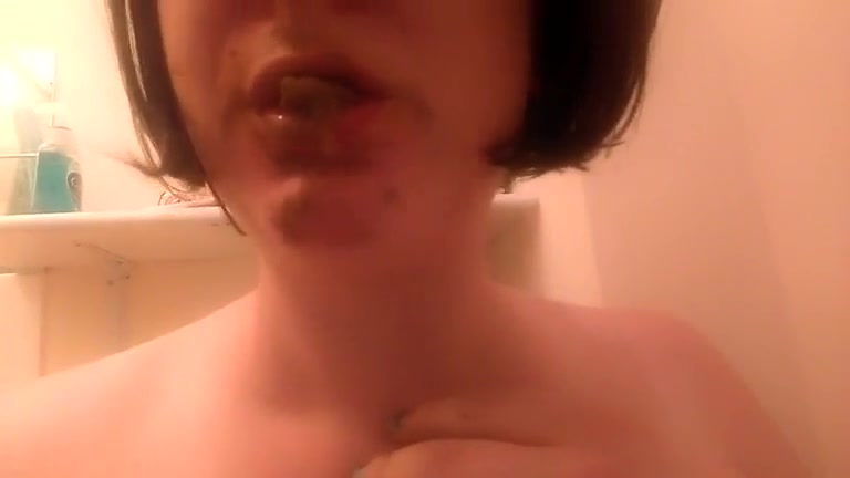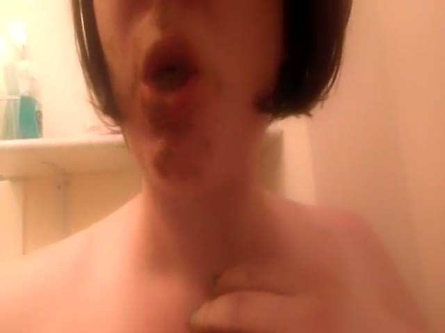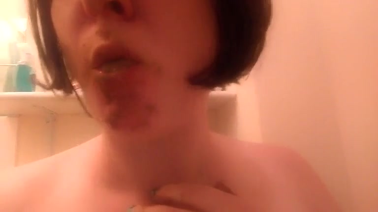 Amateur girl records herself while she's eating poop slowly. She slowly smears poop on her face.