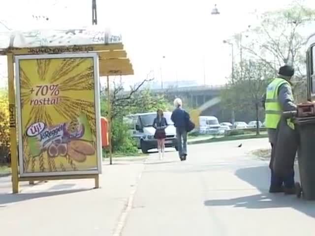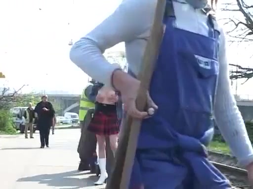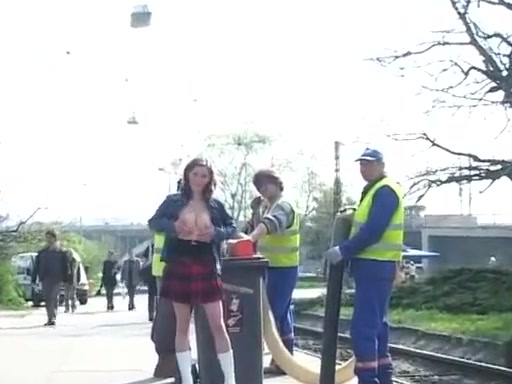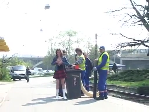 Sexy virgin peeing in public, on the ground. She's peeing with pressure near some workers that are watching her.