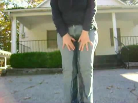 Sexy milf peeing with pressure in her grey pants in public. She did that cause she couldn't find a public bathroom in time.