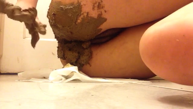 Amateur girl sits naked on bathroom floor. She's smearing fresh poop on her ass and shaved pussy.