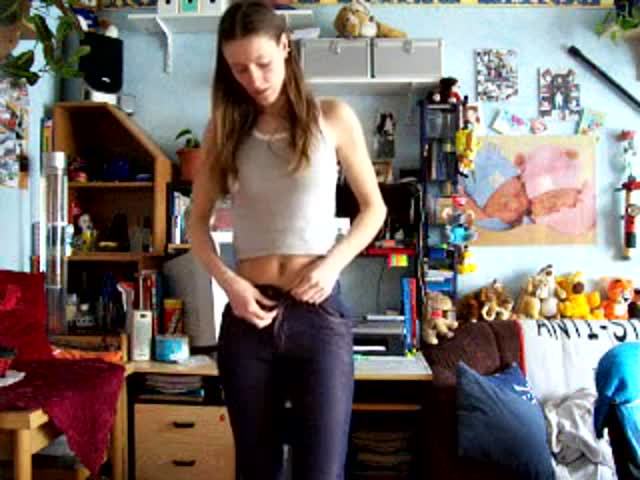 College girl pulled her tight blue jeans down so she can easily pee on bedroom floor. She did that cause her toilet was out of service.
