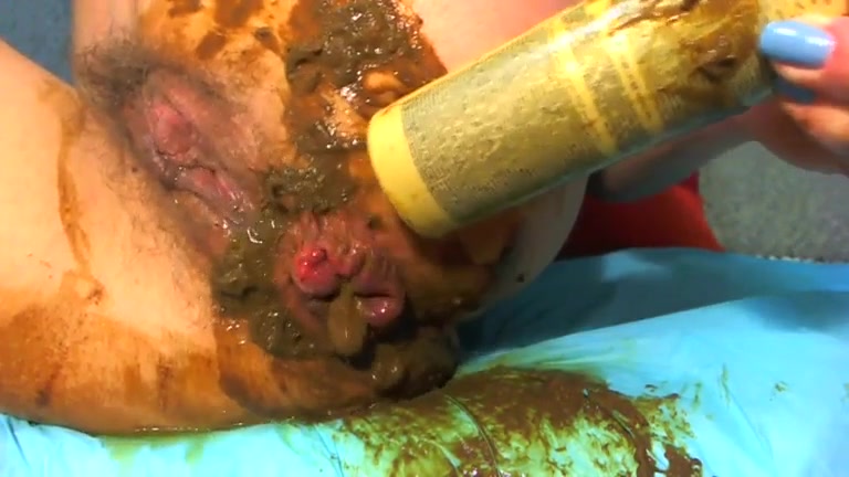 Young girl rubbing fresh poop on her entire body. She's masturbating with a big shampoo bottle.