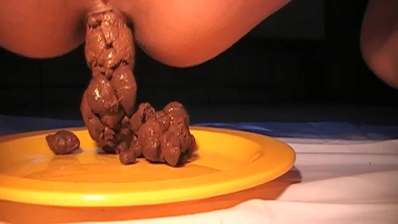 Sexy babe records her shaved pussy and ass in close up while she's pooping a fat turd on an orage plate.