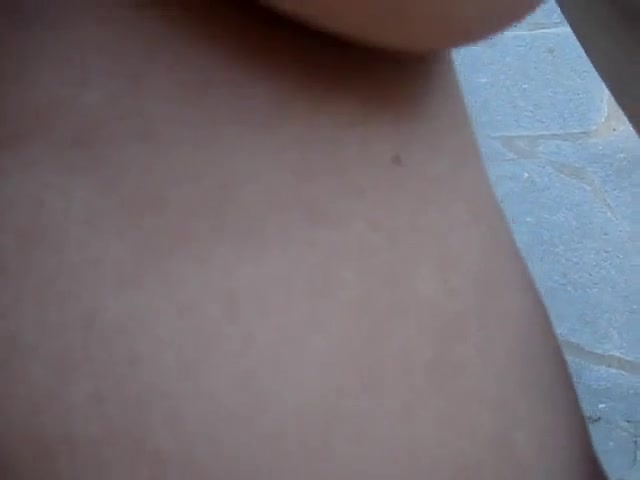 Sexy milf sits naked on a white plastic chair while her younger boyfriend is peeing on her tits.