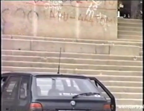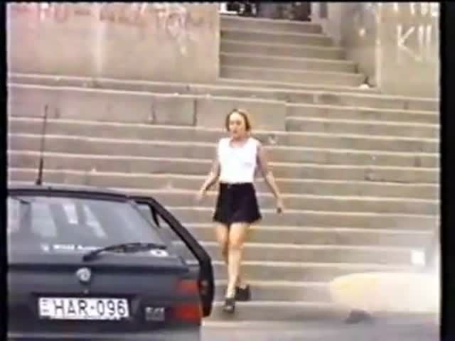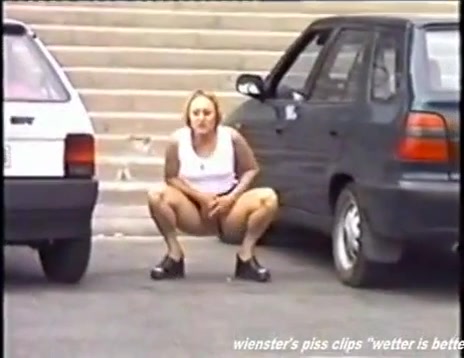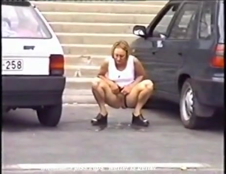 Amateur blonde decides to pee behind a parked car because she couldn't find a bathroom in time.