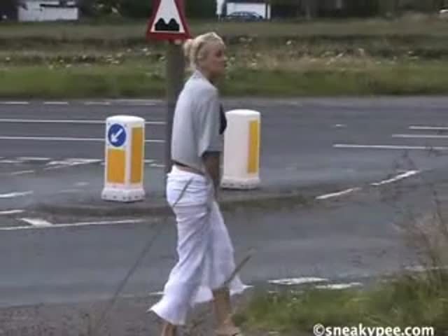 Cool blonde girl went to pee in a public place. She pulled her white lace panties aside, to avoid getting her panties wet.