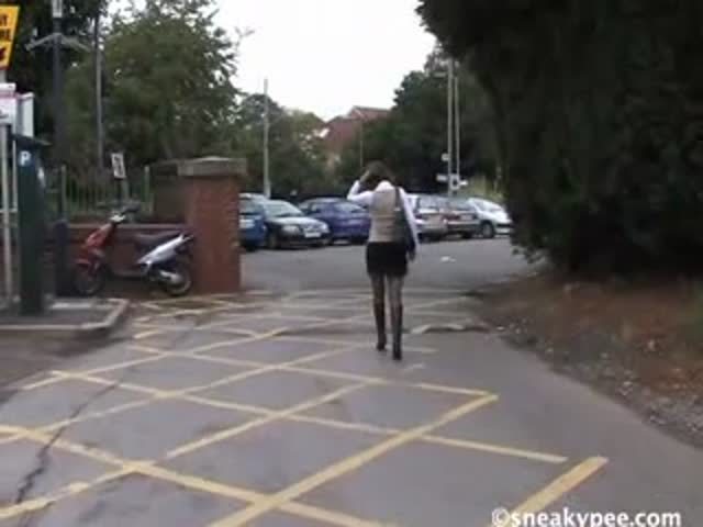 British secretary pulled her black skirt up so she can easilly pee on the ground, outdoor.