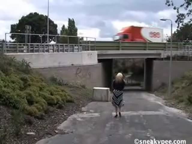 Blonde woman went in a public place to pee. She pissed her panties by mistake.