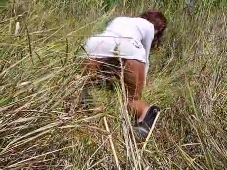 Brown haired shemale went to take a nasty picnic. She's pooping in her panties while sitting on her knees.