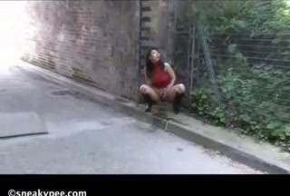 Beautiful Asian girl peeing on the ground, under a bridge. She couldn't find a public bathroom in time.