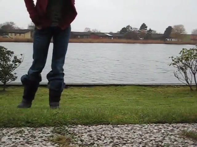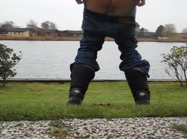 Amateur girl pulled her pants down so she can easily poop on the ground, outdoor.