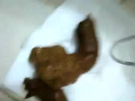 Brunette Italian girl sits naked on bathroom floor. She's eating her own pile of shit after she just finished pooping.