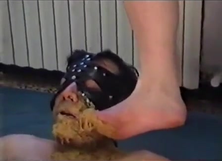 Man slave sits naked on his back while his mistress is pooping on his entire face. He's eating all that poop without gagging.
