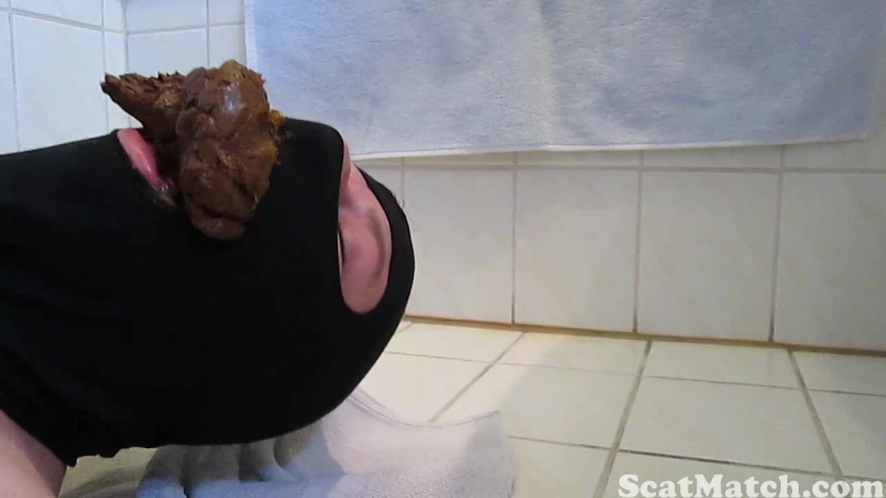 A man in a black mask gets his girlfriend to take a huge shit in his mouth, chew it and ends up with it in his throat.