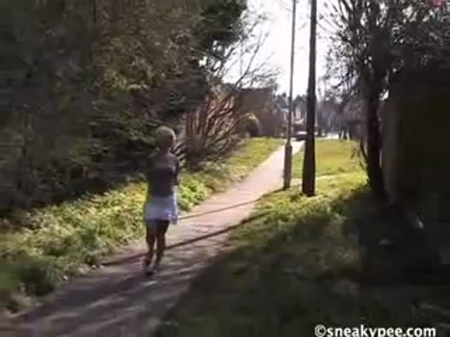 Blonde teen peeing in white skirt with pressure. She didn't pulled her white panties aside.