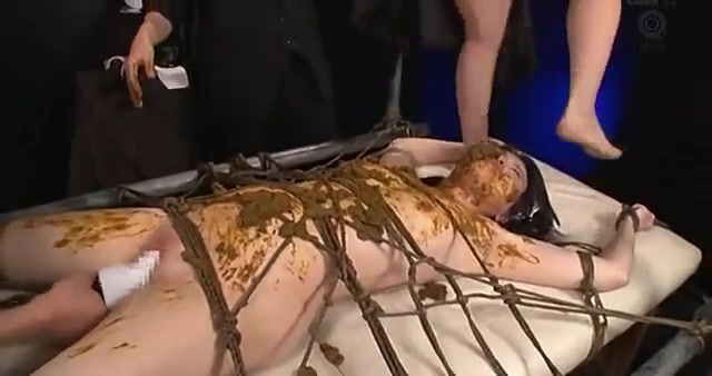Bunch of girls and boys are smearing poop on a bondaged teen. They tied her on a wooden table so she can't move.