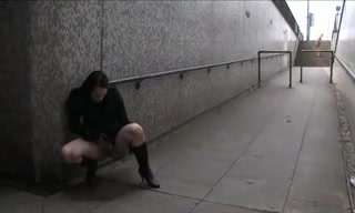 Hot brunette is peeing in an underpass because she couldn't find a public bathroom in time.