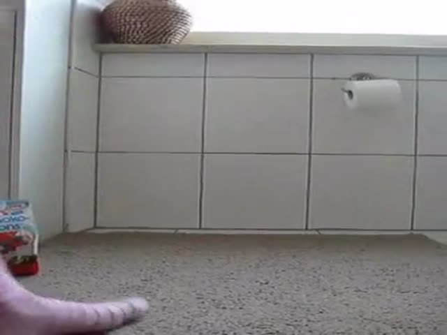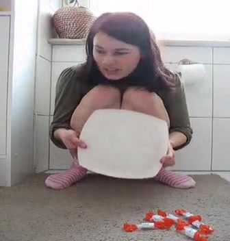 Young girl eating candies while she's pooping on a white plate. She did that in kitchen.