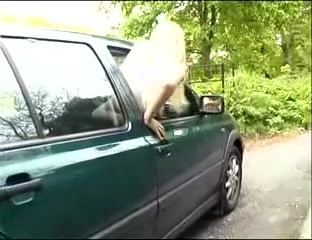 Blonde babe is peeing with pressure from her window car cause she couldn't find a public bathroom in time.