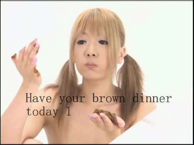 Brown haired Japanese sits naked on her knees while she's eating poop from her hands.