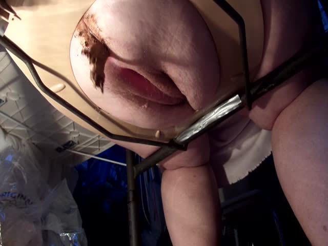Fat girl sits naked on a homemade toilet while she's pooping a very big turd on bedroom floor.