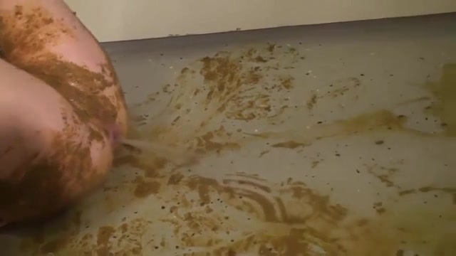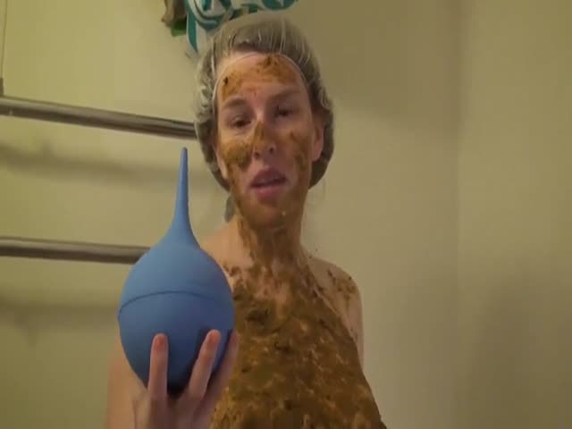 Sexy milf covered her entire body with her fresh poop. Like that was not enough she inserts water into her as so she can poop liquid shit with pressure.