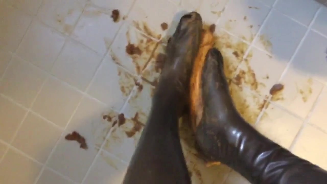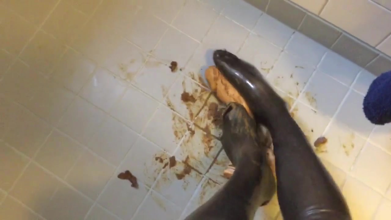 Rubbing shit on her latex feet