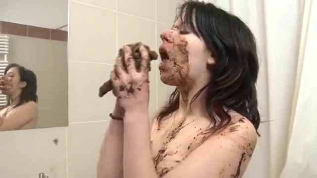 Dark haired teen did a real mess in her brown pantyhose. She smears that poop on her entire body and even eats some of it.