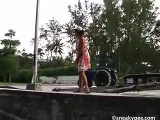 Blonde babe decided to pee in a public bathroom because she was to lazy to search for a public bathroom.